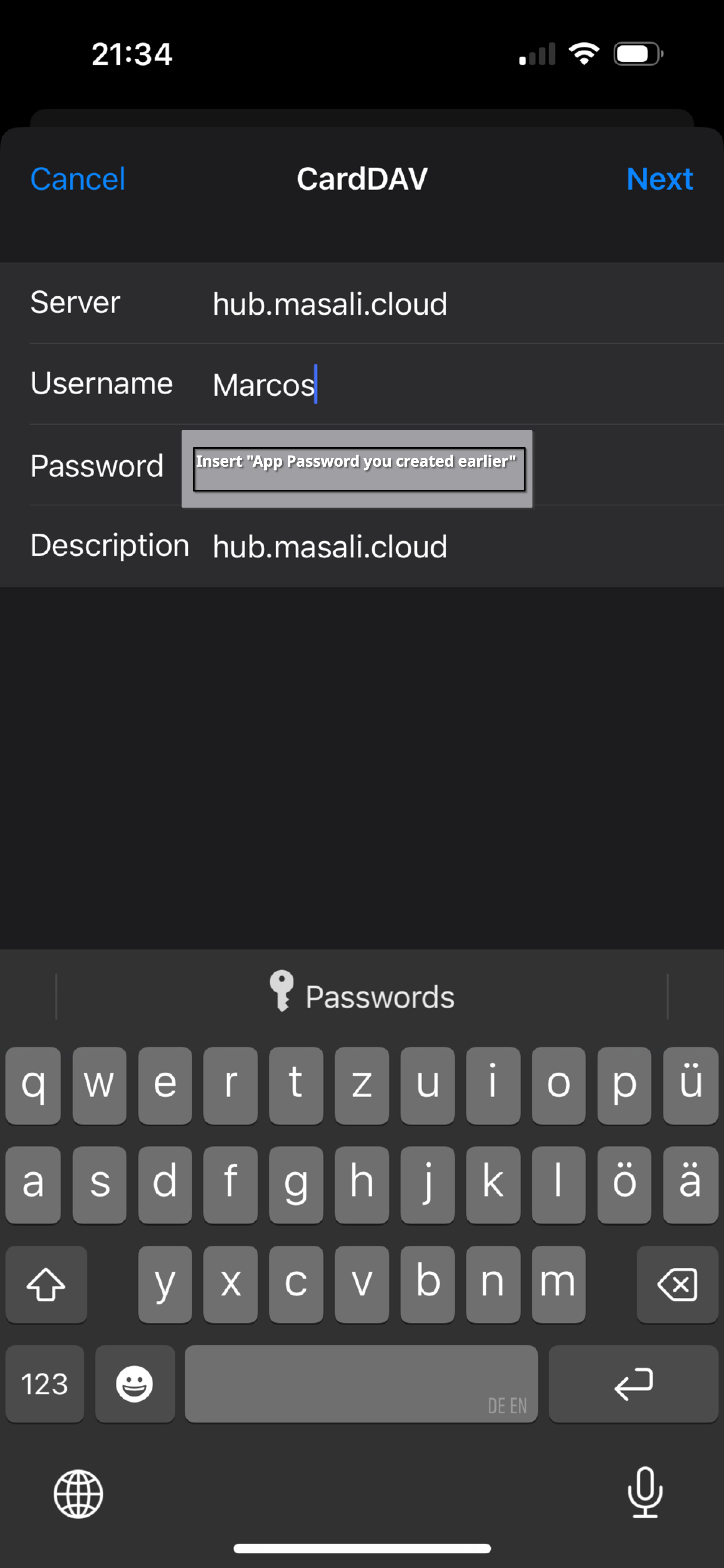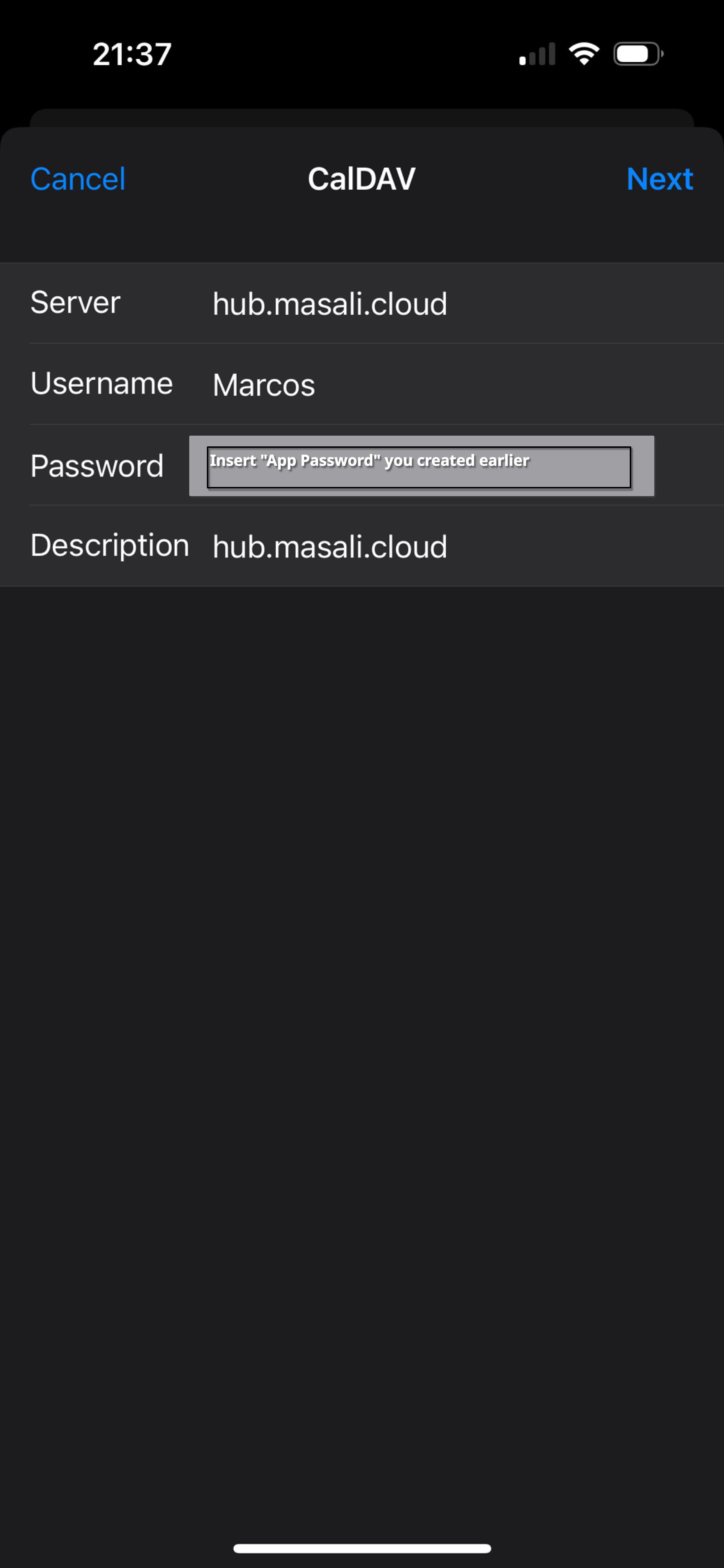 To add contact synchronization, go to: Settings -> Calendar -> Accounts -> Add Account -> “Other” -> “Add CardDav Account”... and fill in the fields as shown below.